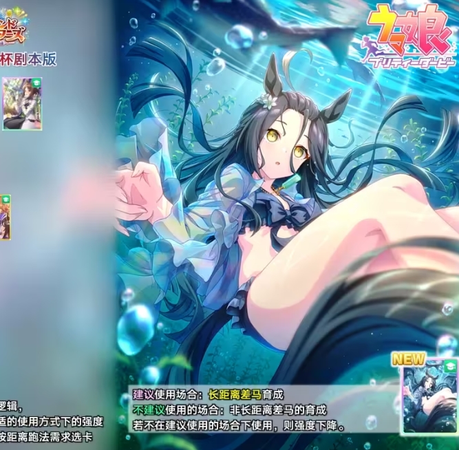 评测图中会标注对应的评级,评级越高意味着该卡在合理运用场景下的强度表现越出色。(例如:智茶座适用于长距离差马,因此在这一特定场景中它能达到UF3的强度等级,具体可参考下图)。需要注意的是,UG及以上的评级会包含小数字以实现更精细的划分,比如从UG到UG5的跨度,其意义相当于S到S+的评级提升幅度。