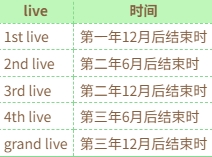 剧本里有5次特殊Live,具体是4个告知Live和1次Grand Live,相关时间可参考表格。
