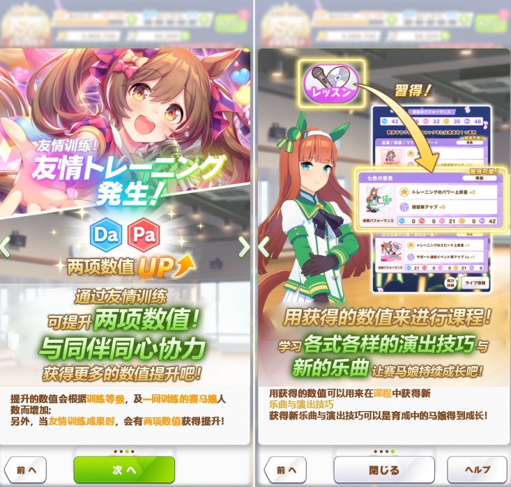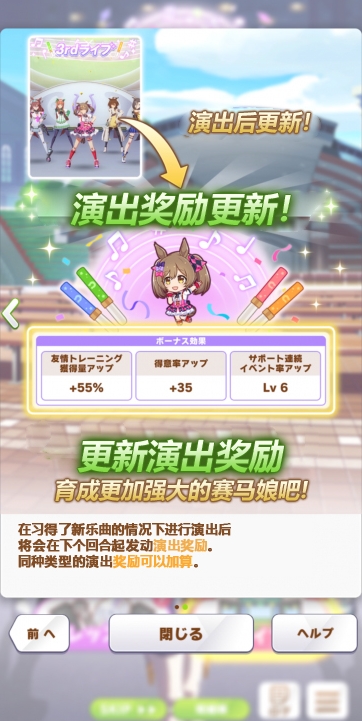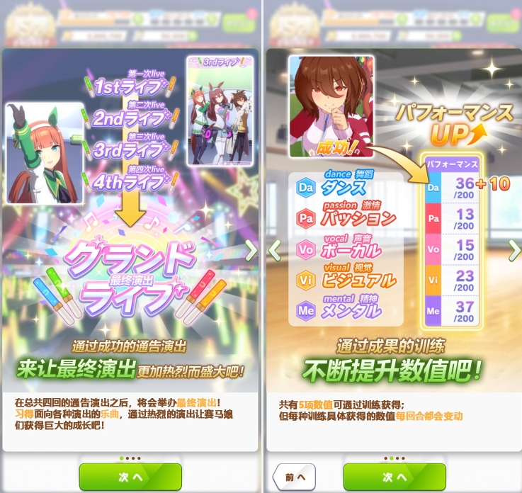 训练所提升的表演力数值,会受到训练设施的等级、共同参与训练的支援卡以及协助者的人数等因素带来的加成影响。