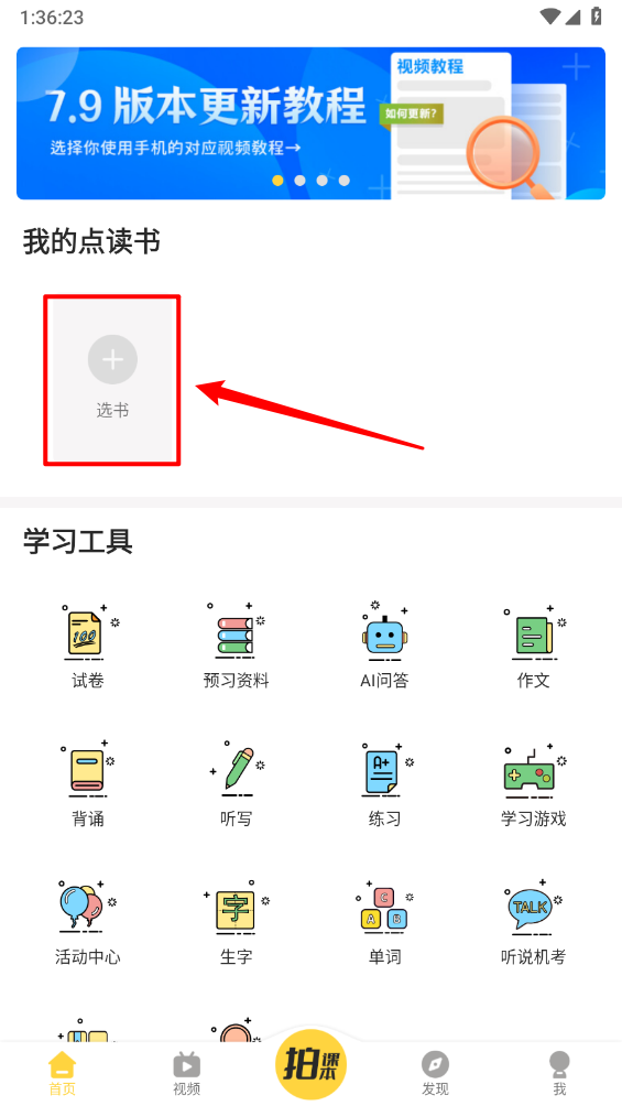1、打开软件,进入首页在我的点读书中点击"选书"。