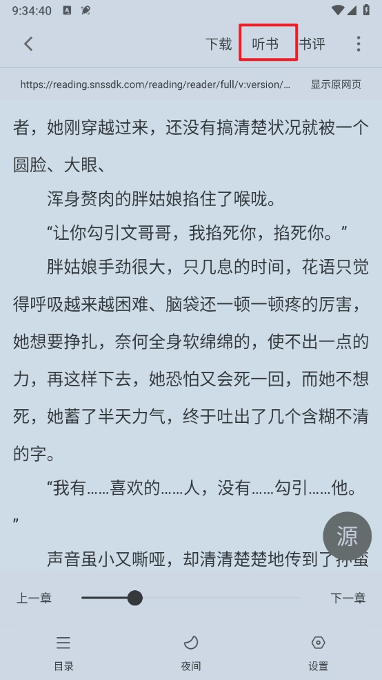 2、然后打开进入小说阅读界面,点击"听书"按钮即可。