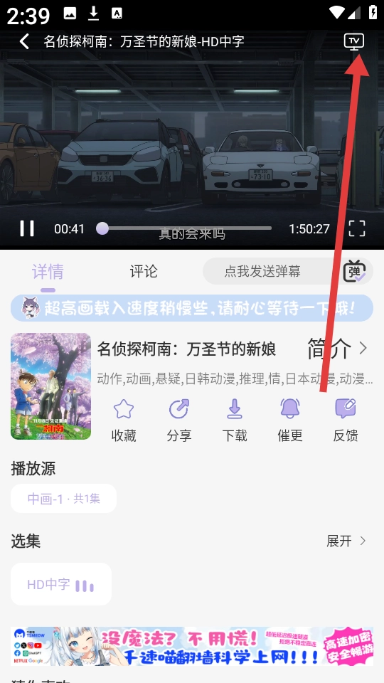 2、这里以“名侦探柯南”为例,找到右上角的“tv”标志。
