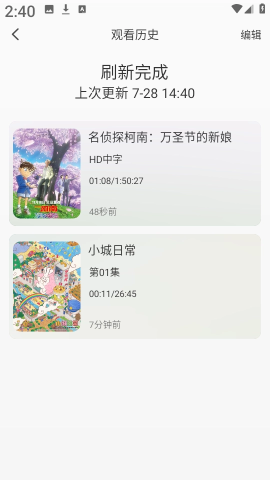 3、然后就可以看到最近的历史播放记录了,长按即可编辑。