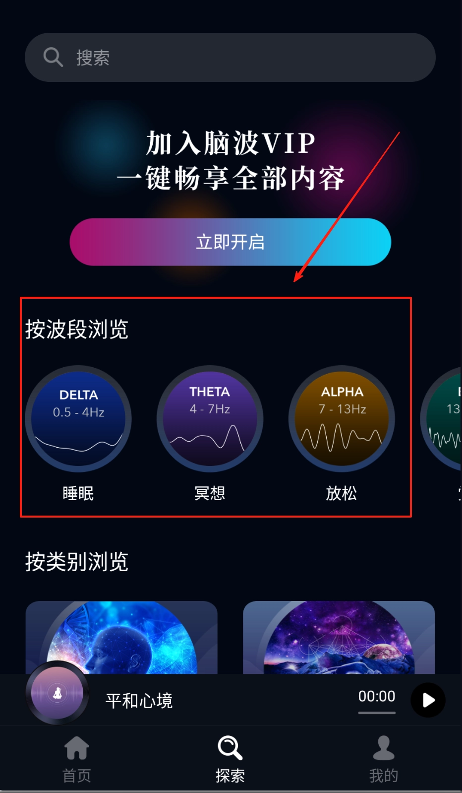 2、进入曲库按Beta-Alpha-Theta波段顺序选择音频,购买前可试听免费片段。