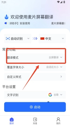1、打开软件并授予悬浮窗权限,在主界面选择全屏或区域翻译模式,即可实时翻译屏幕上显示的外语内容。
