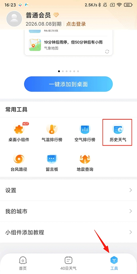 1、打开2345天气王,点击工具-常用工具-历史天气;