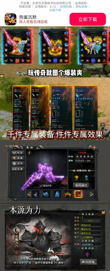 1、这是一款主打静默剧情的传奇佳作,数千件专属装备与琳琅满目的BUFF属性构筑起独特的游戏世界。在跨越多大陆的探索之旅中,你既能通过打怪获取强力装备,也能参与自由交易互通有无,更能体验创新玩法与均衡数值碰撞出的热血传奇魅力,紧张激烈的对决让人沉浸其中、欲罢不能。