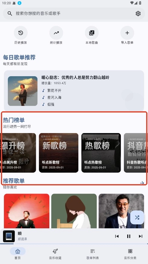 1. 启动听点音乐应用程序,进入首页后,能够浏览热门歌曲、歌单以及推荐榜单。