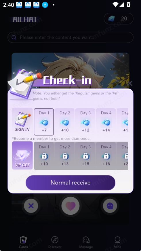 lolipop 是一款专为二次元爱好者打造的ai聊天软件,每天签到可以获得普通宝石、vip宝石,不过不能同时获得两者,搜索框可以搜索你想要的内容,底部分了卡片、发现、消息以及我的。可以与数百位风格迥异的 AI 角色展开实时对话。