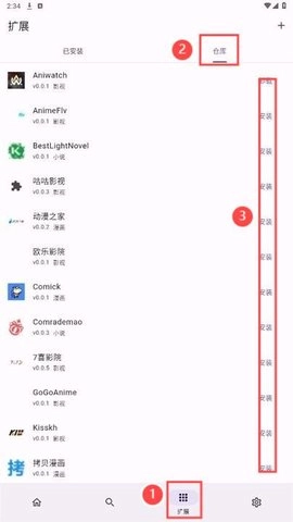 1、打开Miru,点击下方拓展的功能,然后点击右上角的仓库