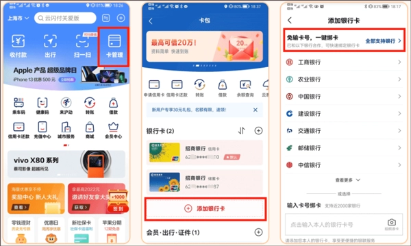 支持上百家银行随时随地一键绑卡,绑卡流程,快捷方便,再也不用担心出门忘记带卡啦。