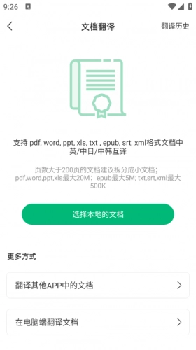 该应用可翻译文档,只要进入点击文档就好了,进入文档页面后,可选择本地文档,或者更多方式如翻译其他中的文档或者在电脑端翻译文档,还支持pdf,word,ppt,xls,txt,epub,srt,xml格式文档中英、中日、中韩互译。