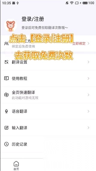 3、点击【登陆/注册】去获取免费次数