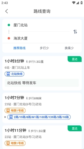 3、能够迅速查询到厦门市的公交线路、换乘规划、公交车实时位置,以及首班车和末班车的发车时间。