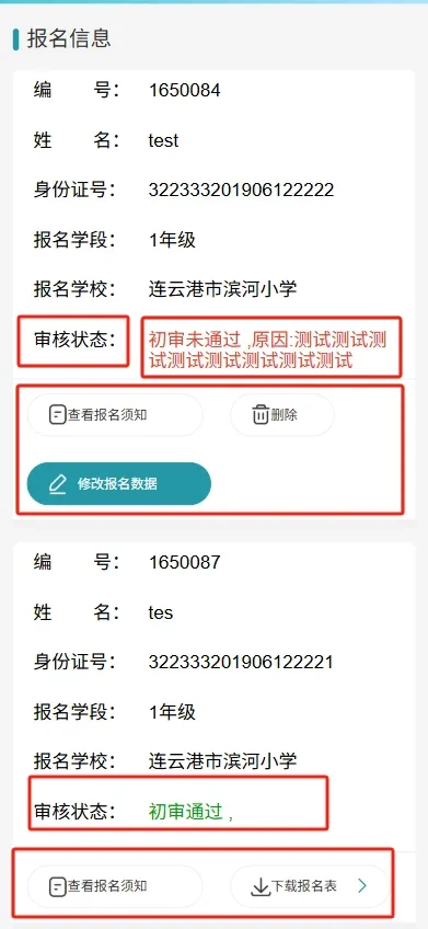 完成信息填报后,请家长朋友们耐心等待审核结果,及时查看审核状态(如初审未通过,请根据“审核状态”一栏中的提醒内容,及时修改相关信息),审核通过后可报名表。