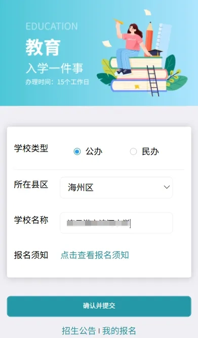 选择报名学校(包含学校类型、所在县区、学校名称),查阅学校报名须知,点击“确认并提交”后即可完成。
