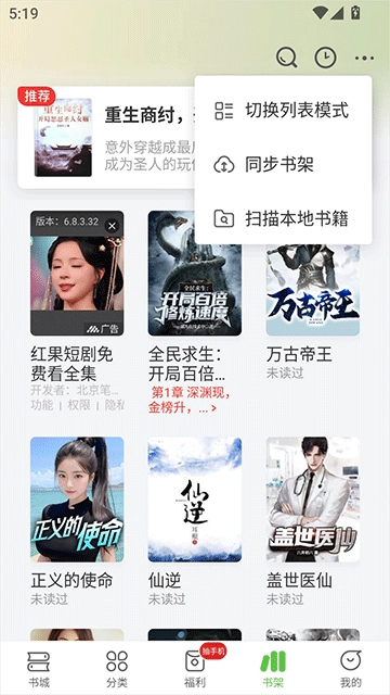 1、打开,在首页点击底部导航栏的“书架”,进入书架界面