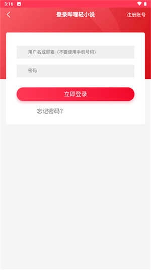 1、安装哔哩轻小说后,首次使用需完成注册并登录账号;