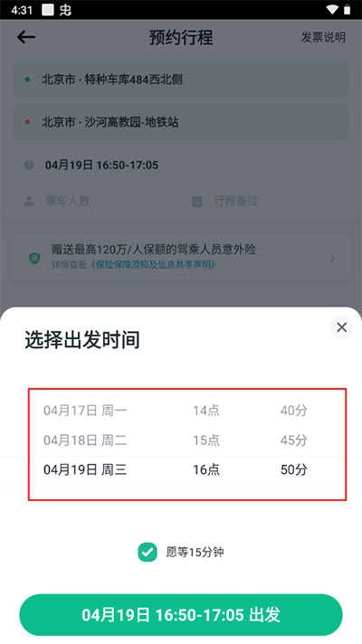 5、设置出发时间,可选择即时出发或预约未来行程。
