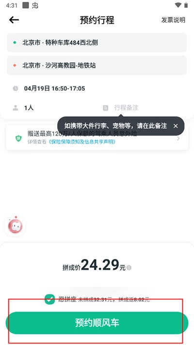 6、完成所有设置后,点击“预约顺风车”按钮即可发起订单。