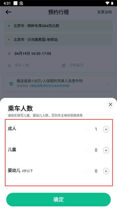 4、确认乘车人数,确保信息准确无误。