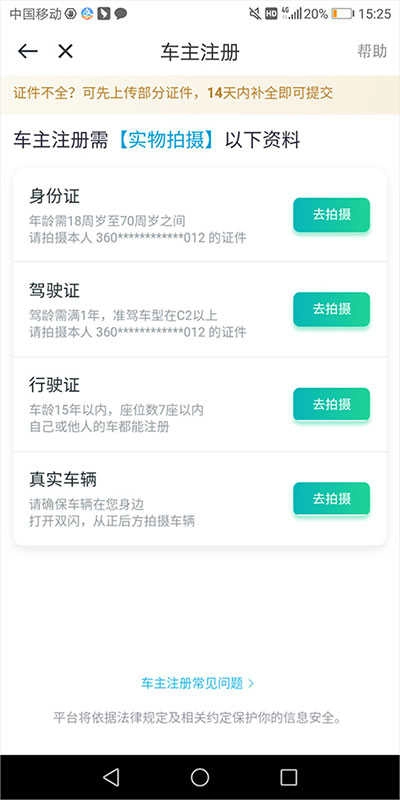 3、进入车主认证界面后,点击“立即注册车主”按钮开始申请流程;