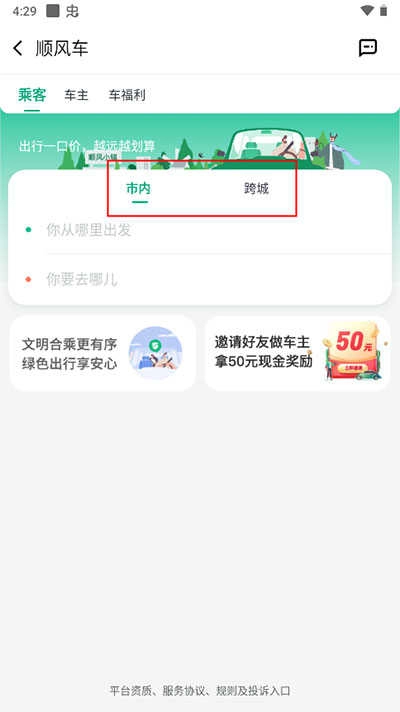 2、根据实际需求,选择市内顺风车或跨城顺风车,并输入出发地和目的地信息。