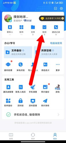 首先打开软件,待完成备份后,点击【我的】进入云端备份数据管理界面,在该界面中找到【短信】选项并点击。