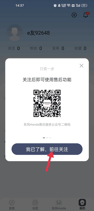 3、点击允许后,通过微信扫码关注东风本田售后服务公众号,接着返回绑定微信的界面,再次点击允许进入。