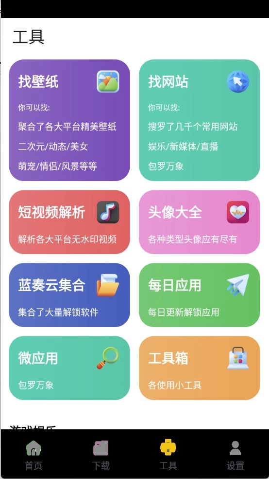 3、进入到“工具”页面,可以看到很多的工具,例如短视频解析、表情包以及壁纸等。