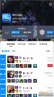 4、点击排名榜上的ID,能够查看最近战绩、实时战绩以及近期的对局伙伴,此外还包含常用英雄等信息。