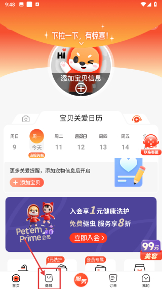 1、打开宠物用品类,点击底部商城选项,进入商城页面。
