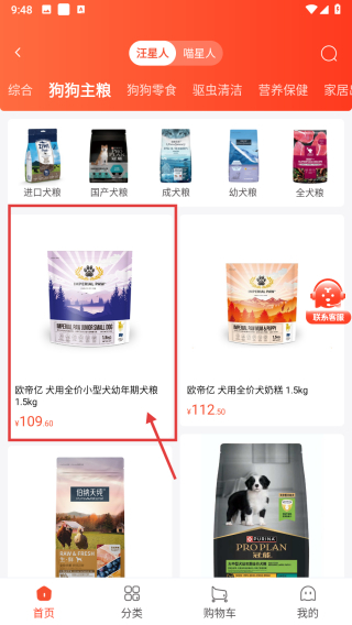 2、在商城页面,点击狗狗主粮分类标签,进入狗狗主粮商品列表页面。