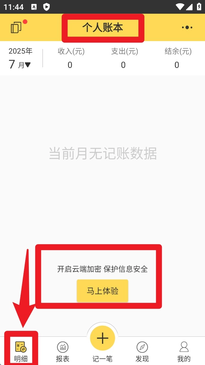 1.打开App进入首页后,点击下方导航栏中的明细,查看当月收入与支出详情,点击按钮可体验开启云端加密功能。