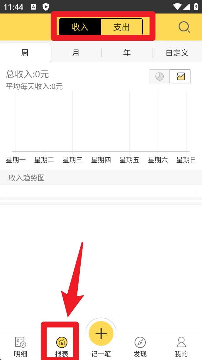 2.切换到报表页签,选择收入或支出标签,可查看一周、月、年或自定义时间范围内的收支图表趋势。