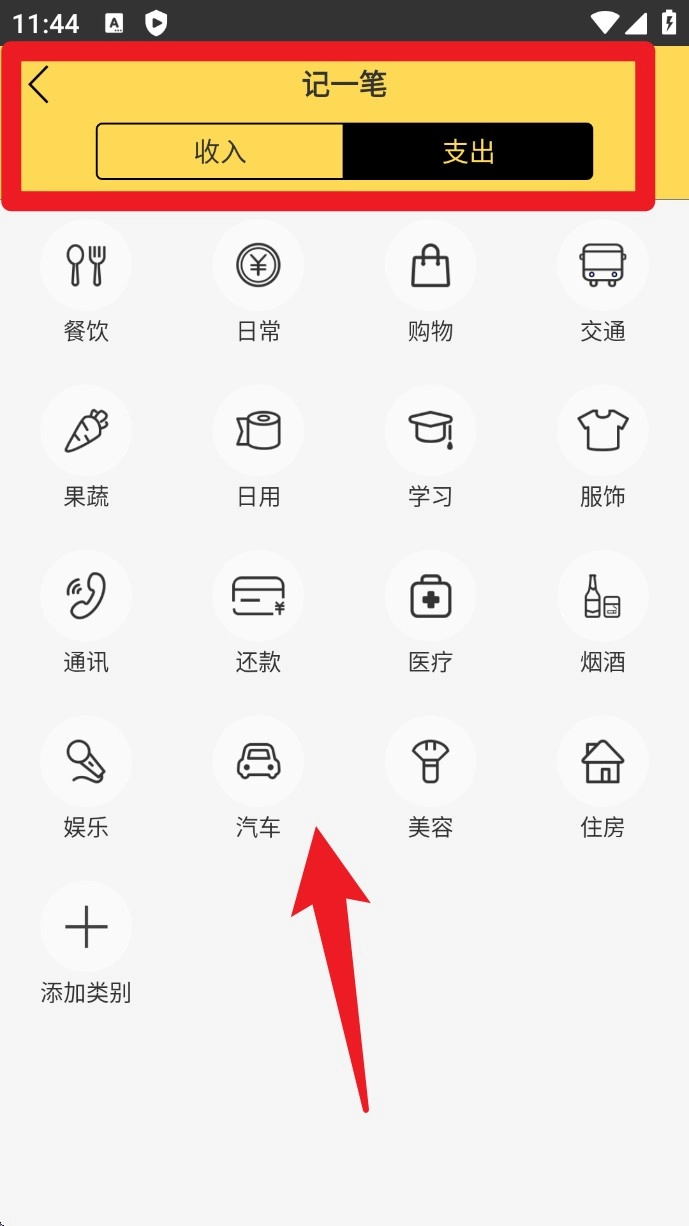 3.点击底部中间的记一笔,选择支出或收入项目,添加类别如餐饮、日用、汽车等,快速完成记账操作。
