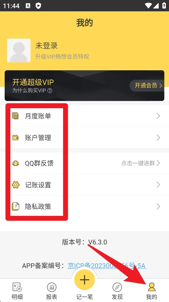 4.进入我的页面后,可浏览月度账单、管理账户、设置记账方式,还能查看隐私政策与加入QQ群反馈。