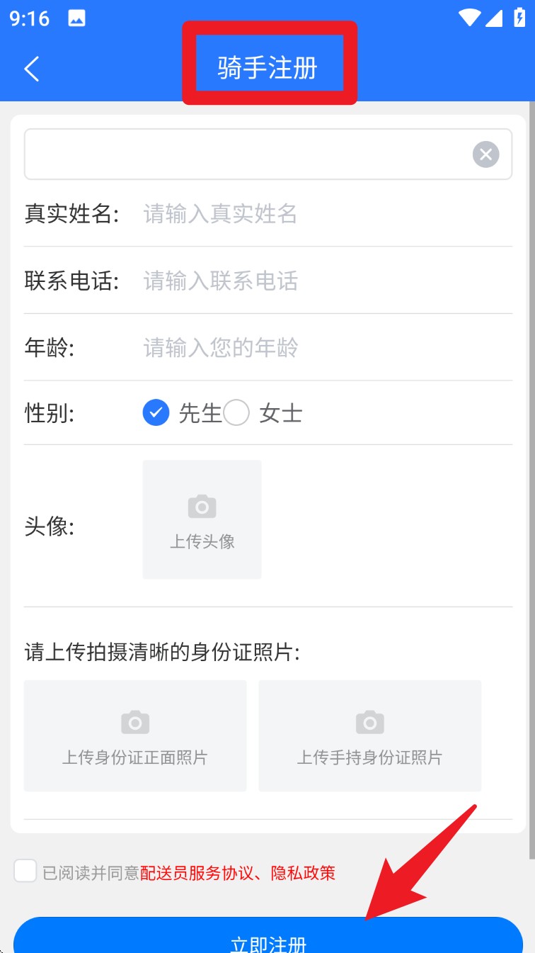 1初次启用前,请先找到并点击“骑手注册”入口,依次填写姓名、联系电话、年龄等基础信息,接着上传所需的证件照片和手持证件的照片,之后勾选相关协议条款,最后点击“立即注册”按钮完成操作。