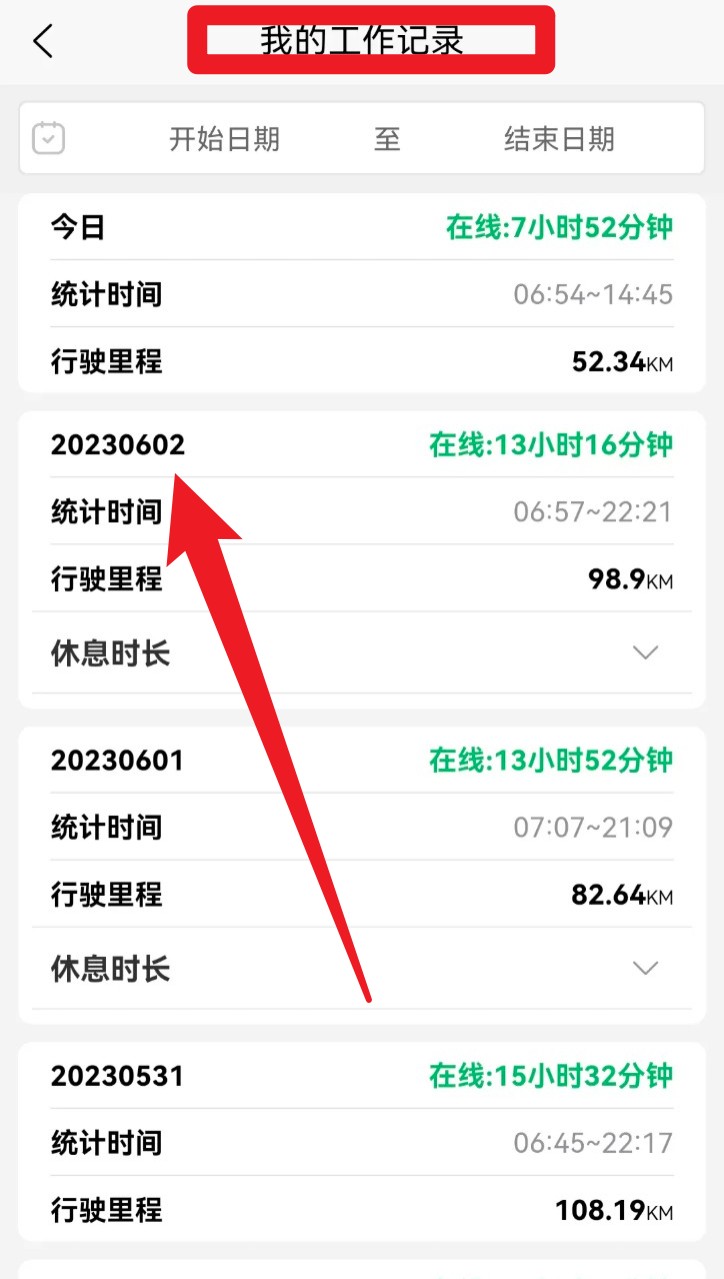 5. 若想了解每日配送情况,可点击“我的工作记录”,这里能看到每日在线时长、配送里程以及统计时间,便于核算工作量和绩效。