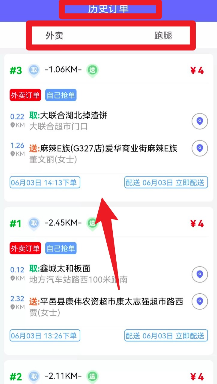 4点击“历史订单”选项,能查看过去所有已完成的派单信息,系统会自动将订单分为“外卖”和“跑腿”两类,其中涵盖了下单的具体时间、配送的实际距离以及客户的相关资料。