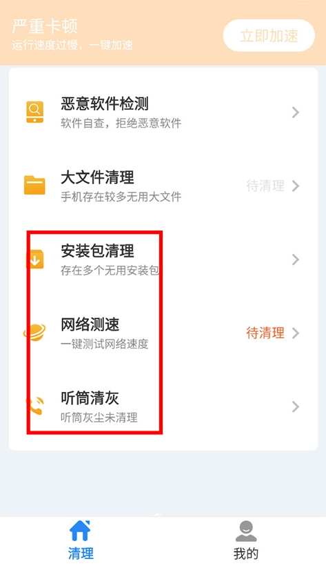 5、通过“安装包清理”功能,可检测并清理手机内多余安装包,还支持网络测速、听筒灰尘检测等实用功能。