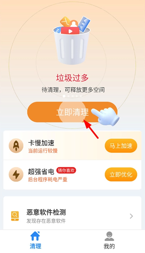 1、安装超神清理App后,打开应用进入首页清理页面,可选择“垃圾清理”“手机加速”“超强省电”等功能,点击“立即清理”开始优化。