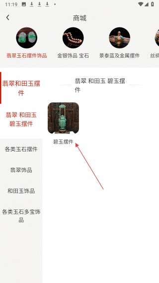 2在翡翠玉石的分类页面中,找到并点击【碧玉摆件】这一选项,即可浏览该类别下的商品集合。