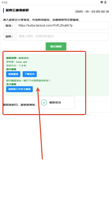 3、接下来,完成粘贴操作后点击“提交解析”按钮,稍作等待(大约几秒时间),就能成功完成解析,具体效果可参照图示。
