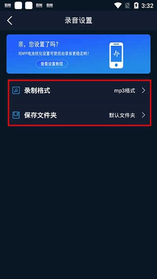 2、点击首页右上角的齿轮图标进入设置界面,在该界面中可以自定义设置保存路径以及录音格式。