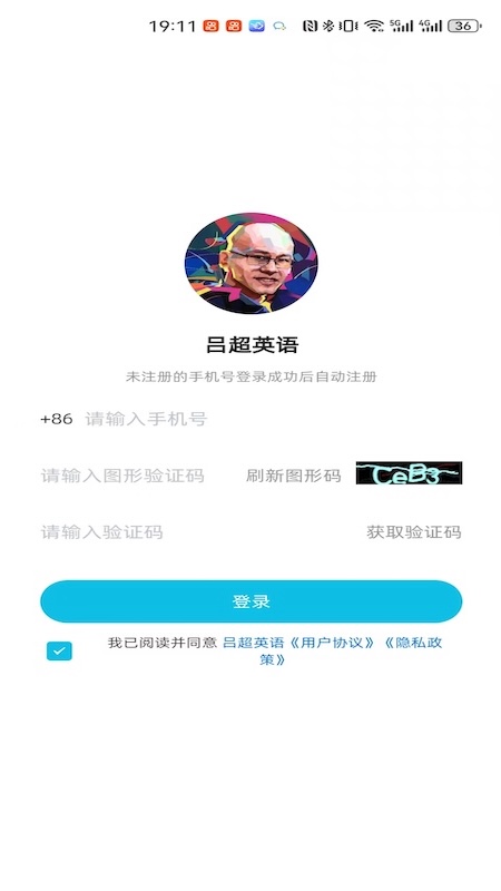1打开吕超英语应用程序,进入登录界面,填写手机号码完成注册流程。