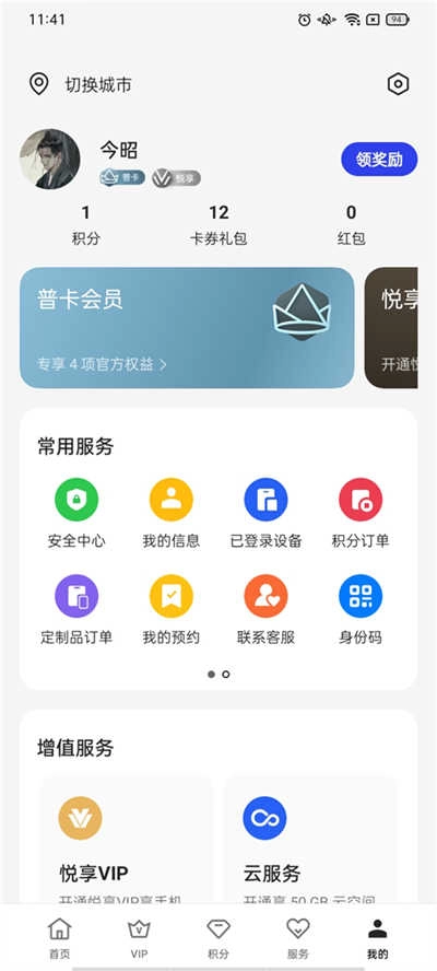 支持城市切换功能,可集中展示头像、昵称、积分、卡券等个人相关信息,同时整合安全中心、云服务、悦享VIP等常用服务与增值服务入口,实现OPPO生态服务的一站式管理。