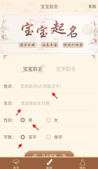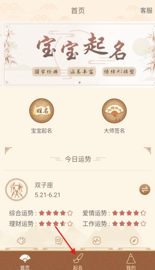 1打开软件后,点击导航栏里的“起名”选项,即可进入起名功能页面。