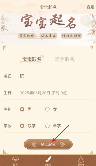 3所有信息填写完毕后,点击页面上的“立即取名”按钮,即可得到对应的取名结果。