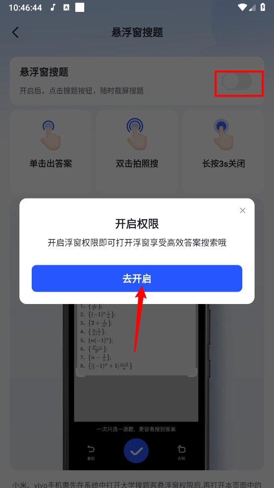 4、然后打开悬浮窗搜题的开关,开启浮窗权限即可打开浮窗享受高效答案搜索。